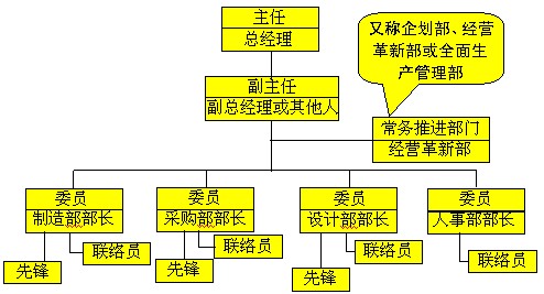 如圖所示,在持續(xù)改善管理委員會中,由總經(jīng)理擔(dān)任主任,副總經(jīng)理或其他愿意變革的人擔(dān)任副主任。常務(wù)推進(jìn)部門負(fù)責(zé)全面推進(jìn)或跨部門推進(jìn)課題,在國內(nèi)企業(yè)中又稱為企劃部或全面生產(chǎn)管理部等。每個(gè)部門都必須有先鋒和聯(lián)絡(luò)員,由先鋒做起,樹立模范榜樣,然后水平推廣,進(jìn)行跨部門的改善。