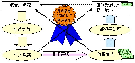 改善最開始的時(shí)候可以不完全以經(jīng)濟(jì)目的為重,隨著改善的推進(jìn)逐漸把經(jīng)濟(jì)目標(biāo)作為一項(xiàng)改善要求,確認(rèn)其有形的財(cái)務(wù)效果,經(jīng)過部門領(lǐng)導(dǎo)的認(rèn)可后,將事例發(fā)表和展示出來,并對當(dāng)月最有價(jià)值的員工進(jìn)行表彰,過程如圖所示。