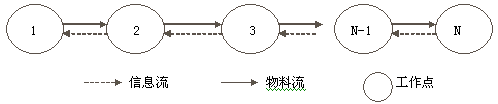 如圖所示,虛線代表信息流,實(shí)線代表物料流。拉動(dòng)式生產(chǎn)方式的物流是從工序1、2、3,一直流到第N道工序,它的信息流則是從第N道工序開始,一步一步向工序3、2、1輸送。因此,它的信息流和物流是緊密結(jié)合在一起的。
