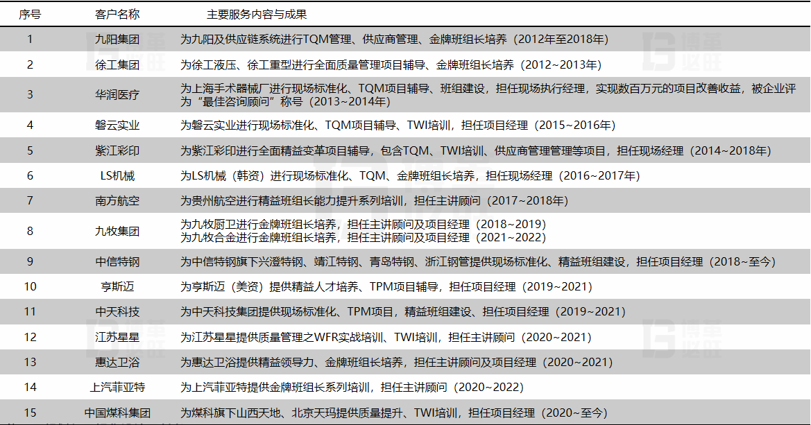 實(shí)戰(zhàn)經(jīng)驗(yàn):結(jié)合豐田、三星、海爾等班組建設(shè)經(jīng)驗(yàn),為企業(yè)量身訂制金牌班組管理系統(tǒng),從班組的基礎(chǔ)/現(xiàn)場(chǎng)/效率/質(zhì)量/設(shè)備管理等維度系統(tǒng)提升班組管理水平,同時(shí)培養(yǎng)精益班組管理人才超過(guò)12000人次;并有效將培訓(xùn)轉(zhuǎn)化為企業(yè)績(jī)效,為企業(yè)成功輔導(dǎo)的質(zhì)量、效率、六源、成本、流程、IE改善項(xiàng)目等超過(guò)1000個(gè),使產(chǎn)品總成本降低30%、制造周期縮短30%、生產(chǎn)效率提升35%、庫(kù)存降低35%、產(chǎn)品缺陷降低30%、物料齊套率提升50%,帶來(lái)的直接財(cái)務(wù)收益數(shù)千萬(wàn)。