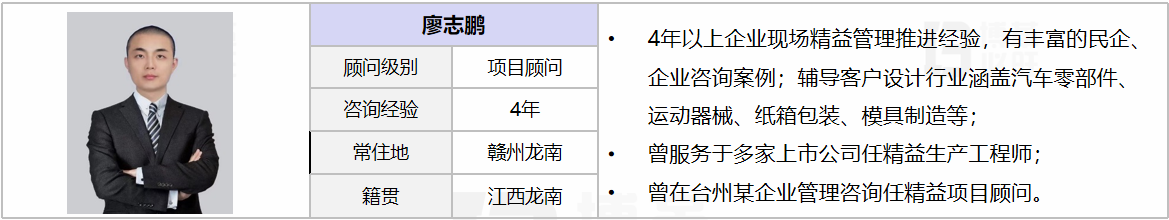 擅長業(yè)務(wù):工廠前期調(diào)研診斷、項目管理、現(xiàn)場基礎(chǔ)管理提升、精益布局規(guī)劃、大型倉儲規(guī)劃、改善項目落地、IE改善手法、質(zhì)量管理、QCD降本增效改善、精益生產(chǎn)配送管理、精益生產(chǎn)項目的推進(jìn)、標(biāo)準(zhǔn)工時開發(fā)、SMED快速換模換線、現(xiàn)場5S改善、與目視化提升、基層培養(yǎng)-打造班組管理、精益體系建立及改善輔導(dǎo)實施跟進(jìn),KAIZEN持續(xù)改善、流程再造,3P、定制化生產(chǎn)線搭建,非標(biāo)工裝自動化設(shè)備開發(fā)與導(dǎo)入。