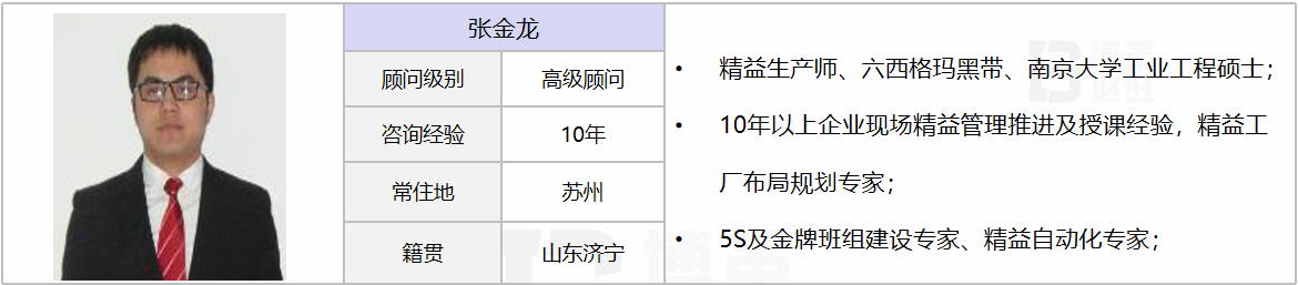 熟悉行業(yè):家電裝配、工程機(jī)械、機(jī)械加工、電子電器、裝備制造 擅長(zhǎng)業(yè)務(wù):擅長(zhǎng)精益工廠布局規(guī)劃、5S及金牌班組建設(shè)、信息化可視化管理,推動(dòng)精益項(xiàng)目實(shí)施快速改善,短期內(nèi)改善生產(chǎn)現(xiàn)場(chǎng),優(yōu)化工藝流程及工藝布局\推動(dòng)全員改善。有豐富的精益項(xiàng)目實(shí)戰(zhàn)推進(jìn)經(jīng)驗(yàn)、推動(dòng)精益項(xiàng)目在企業(yè)整體落地、現(xiàn)場(chǎng)標(biāo)準(zhǔn)化改善、生產(chǎn)效率提升、布局優(yōu)化、培訓(xùn)道場(chǎng)策劃及實(shí)施等、負(fù)責(zé)30+個(gè)工廠精益項(xiàng)目的推進(jìn)與運(yùn)營(yíng),具有豐富的精益咨詢經(jīng)驗(yàn)。