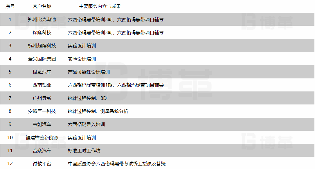 咨詢能力介紹 20年歐美企業(yè)工作經(jīng)驗(yàn),負(fù)責(zé)眾多 6Sigma項(xiàng)目和其他改善活動(dòng); 培訓(xùn)及輔導(dǎo)企業(yè):極氪汽車、寶能汽車、比克電池、保隆科技、全興國(guó)際、巨一動(dòng)力、合眾汽車、超熔科技等; 成功輔導(dǎo)超過(guò)近百名黑帶和六百多名六西格瑪綠帶。曾為中國(guó)多家知名企業(yè)及國(guó)際化集團(tuán)公司導(dǎo)入近百個(gè)六西格瑪改善項(xiàng)目;累計(jì)為企業(yè)帶來(lái)超過(guò)近千萬(wàn)的改進(jìn)收益;