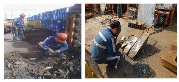 ♦ 井下回收上來的水管吊掛鏈及水管卡子螺栓銹蝕嚴(yán)重,在井下無法分離,回收組組織進(jìn)行用氣割將其連接處割開,將鏈子和水管卡子分類碼放,以便再用
