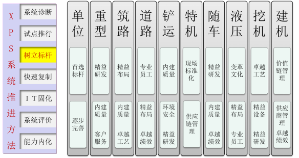 XPS根據(jù)A集團及所處行業(yè)的特點,在A集團的十二五戰(zhàn)略目標為愿景,制定了世界級企業(yè)關注的5大目標,工程機械行業(yè)運營中最重要的12大模塊,提煉出58項要素和235項要求。
