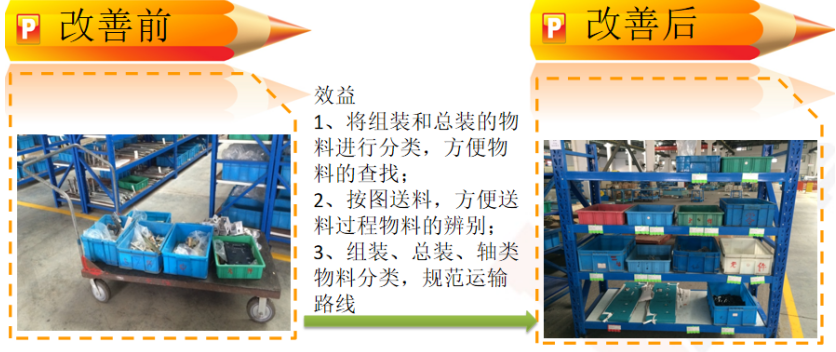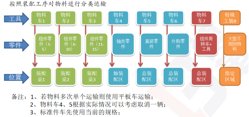 ●搬運(yùn)浪費:物料運(yùn)輸過程中,送料員用平板車,需多批次運(yùn)輸,且需將物料搬運(yùn)至地面;裝配員再將物料搬運(yùn)至裝配區(qū);