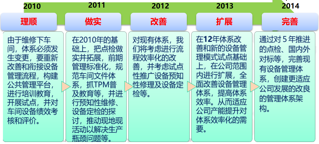 上海普華TPM圍繞著效率化維修戰(zhàn)略,本著循序漸進(jìn),一步一個(gè)腳印的原則進(jìn)行五年規(guī)劃,按照2010年理順、2011年做實(shí)、2012年改善、2013年擴(kuò)展、2014年完善的計(jì)劃進(jìn)行輔導(dǎo);