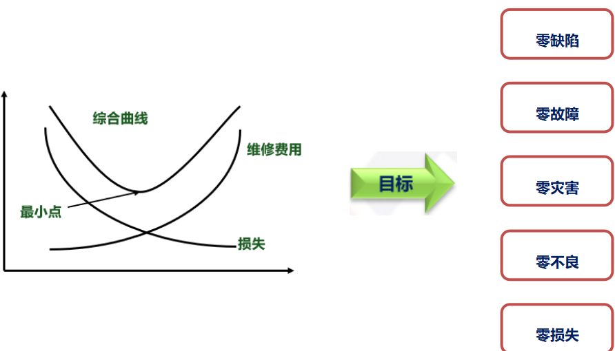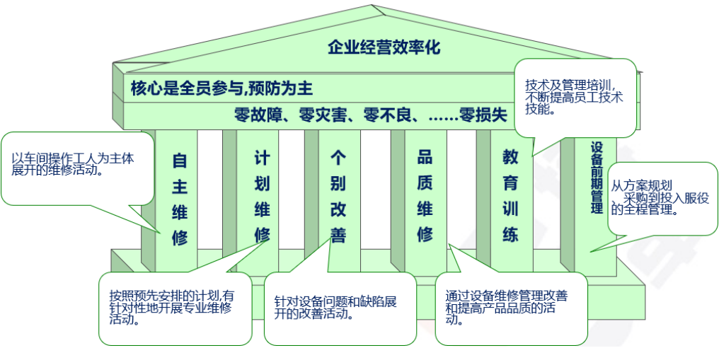 通過(guò)全員生產(chǎn)維護(hù)和持續(xù)改善,最大限度提高設(shè)備綜合效率、延長(zhǎng)設(shè)備使用壽命為目標(biāo),使生產(chǎn)效益最大化,最終實(shí)現(xiàn)零缺陷、零故障、零災(zāi)害、零不良、零損失 。