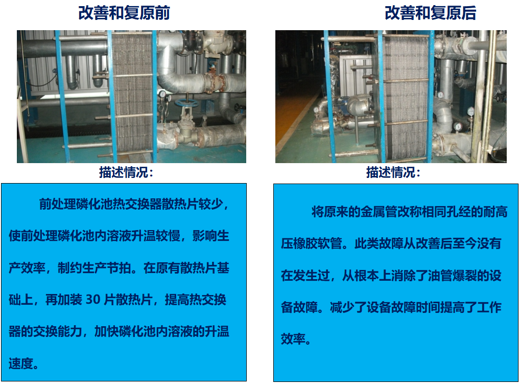 通過(guò)改善使前處理的生產(chǎn)效率提高了,以每輛車(chē)節(jié)約20秒的磷化時(shí)間,全年生產(chǎn)4.2萬(wàn)輛車(chē)計(jì)算,全年可減少開(kāi)機(jī)時(shí)間:42000*15/(60*60)=175小時(shí),前處理每小時(shí)能耗850元,每人每小時(shí)12元工資,前處理班組25人,則全年可為公司節(jié)約: (850+12*25)*175=201250元。