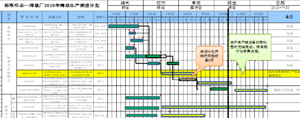 根據(jù)公司的經(jīng)營(yíng)目標(biāo)及發(fā)展方向,提高廠能拉動(dòng)生產(chǎn)已迫在眉睫;而要加快生產(chǎn)節(jié)拍必須先規(guī)范標(biāo)準(zhǔn)作業(yè)。標(biāo)準(zhǔn)作業(yè)是為了實(shí)現(xiàn)作業(yè)人員、作業(yè)順序、工序設(shè)備的布置、物流過(guò)程等的最優(yōu)化組合設(shè)立的作業(yè)方法。為了實(shí)現(xiàn)以低廉的成本生產(chǎn)出優(yōu)質(zhì)產(chǎn)品的一個(gè)作業(yè)基準(zhǔn),項(xiàng)目組首先定年度推進(jìn)計(jì)劃;