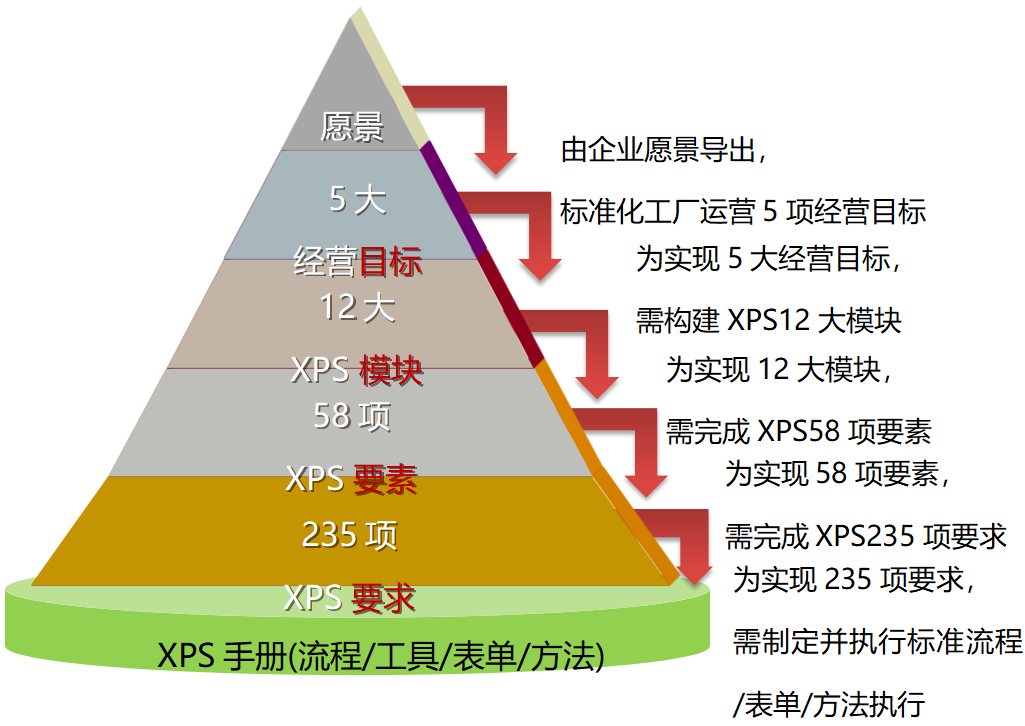 XPS系統(tǒng)架構(gòu)分由理念、原則、模型、目標、要素、要求部分構(gòu)成,其理念為:“XPS-A持續(xù)變革系統(tǒng)”是以A集團及下屬企業(yè)戰(zhàn)略為導(dǎo)向,結(jié)合企業(yè)運營的具體情況,運用世界上最行之有效的績效改善工具和方法,幫助企業(yè)建立和完善高效的運營系統(tǒng)和模式-XPS持續(xù)變革系統(tǒng),使企業(yè)在產(chǎn)品創(chuàng)新、流程創(chuàng)新、人才培養(yǎng)、利潤創(chuàng)新等方面的績效達到世界領(lǐng)先水平,并形成與企業(yè)自身文化相融合的持續(xù)改善文化,構(gòu)筑企業(yè)的核心競爭力。“